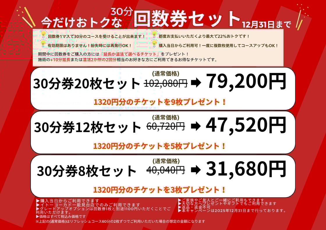 年末の忙しい向けて回数券でお身体のメンテナンスはいかがでしょうか。