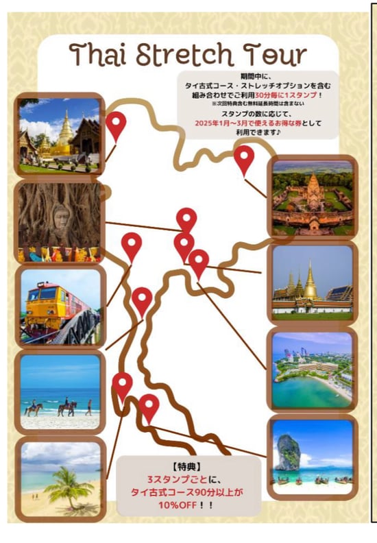 期間中に集めたスタンプ3個ごとにタイ古式の90分以上が10%OFFとなります