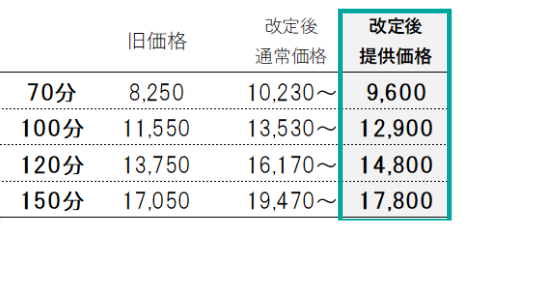 お客様のお疲れに合わせたコース・オプションの組み合わせを提供できるように、メニュー改定後の通常価格よりもお得にご案内いたします。