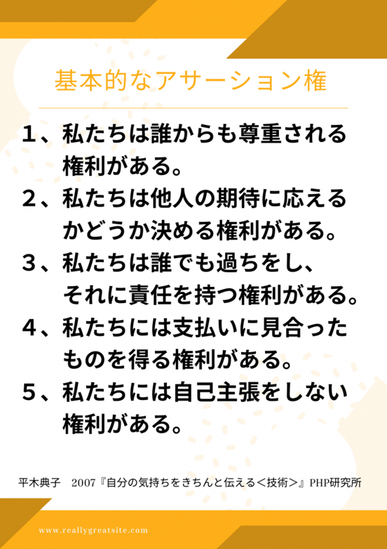 そもそもアサーティブネスという考えは、根本に「アサーション権」という考え方があります。
