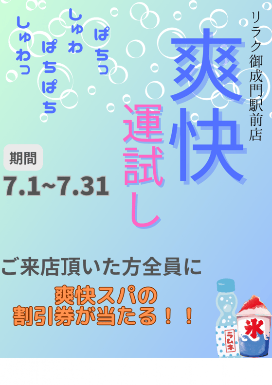 ひんやり感&さっぱり感に加え、「シュワシュワ」「パチパチ」という炭酸泡の音も楽しみつつ、リラックスしていただけるコースです。