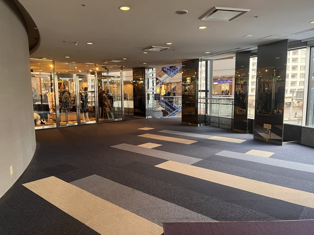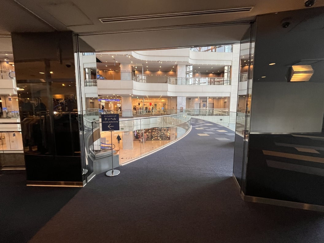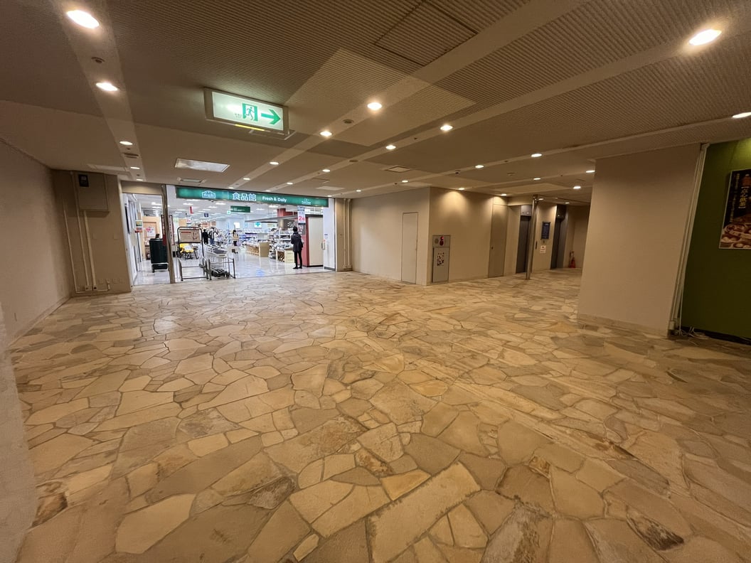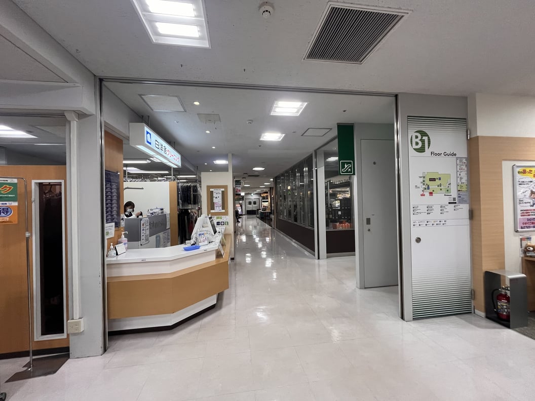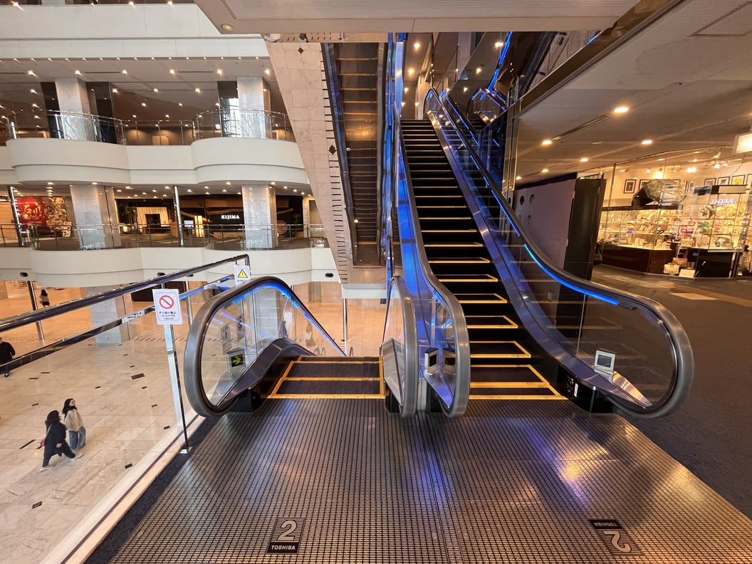 Take the escalator down from the 2nd floor to the Basement 1st Floor (B1F).|エスカレータから2FからB1Fへ