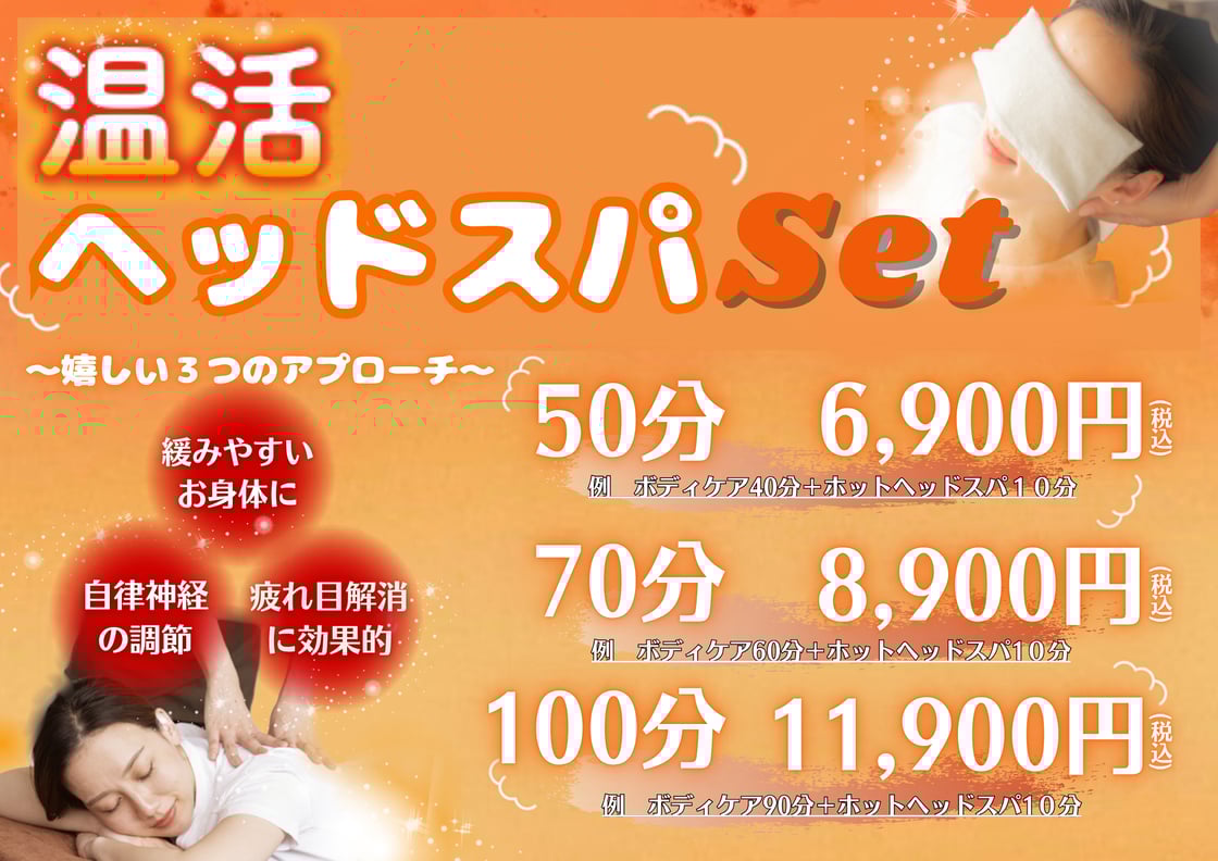 11月、イオンフードスタイル新松戸店では、ボディケアと大人気オプションのホットヘッドスパとの組み合わせです!