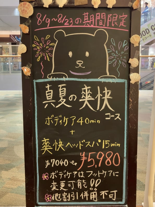 8/23(水)までの限定でボディケア40分+爽快ヘッドスパ15分、フットケア40分+爽快ヘッドスパ15分が特別価格の¥5,980(税込)でご利用いただけます!