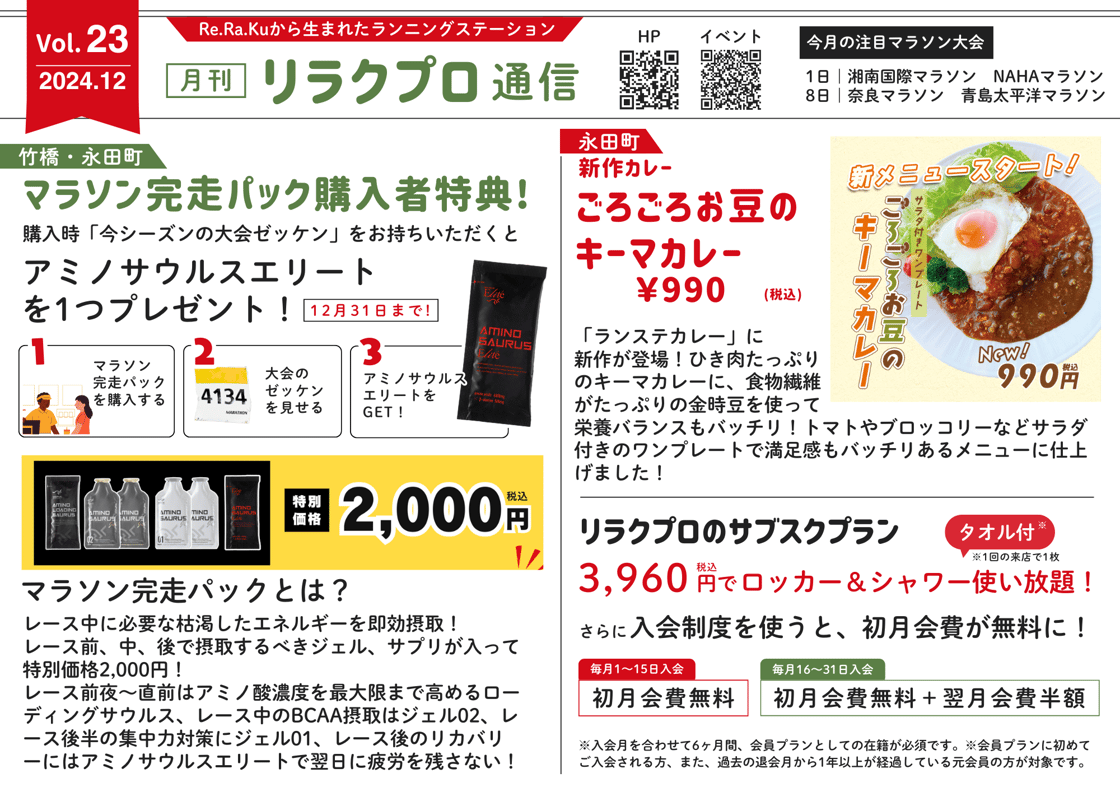 Re.Ra.Ku PROでは毎月様々なランニングイベントを開催しております。健康のために走っている方も、マラソン大会に目標をもって走っている方も、理想の自分に向けて一緒に走りませんか!? 12月のイベント一覧サイトhttps://lit.link/rerakupro 大晦日まで営業しておりますので、走り納めはぜひ、Re.Ra.Ku PROランニングステーションをご利用ください♪