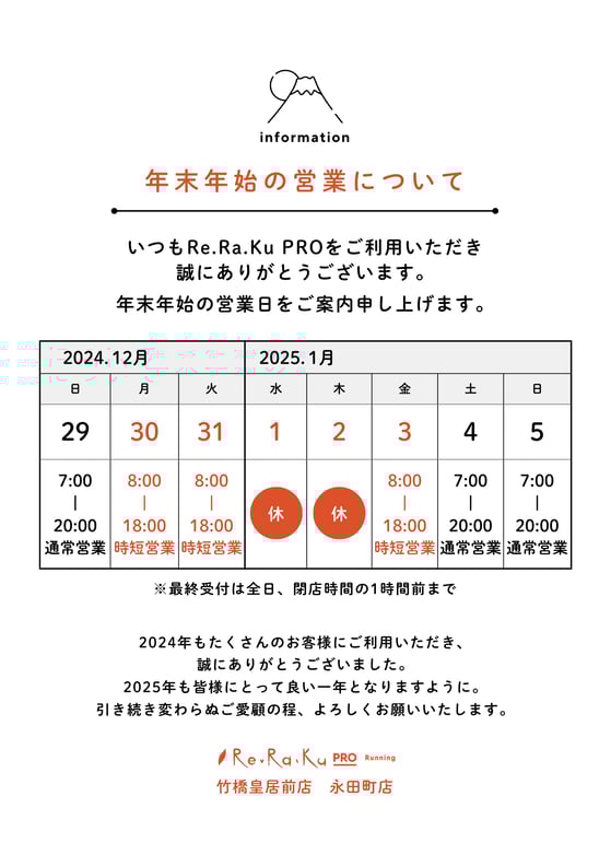 Re.Ra.Ku PRO竹橋皇居前店、永田町店ともに年末年始にあたり下記の通り休業と営業時間の変更をさせていただきます。期間中、大変ご不便をお掛け致しますが、何卒ご容赦いただきますようお願い申しあげます。記29日 通常営業30日 時短営業 8:00~18:00(最終受付17:00)31日 時短営業 8:00〜18:00(最終受付17:00)1日 休業2日 休業3日 時短営業 8:00〜18:00(最終受付17:00)4日〜通常営業以上大晦日まで営業しますので、走り納ランもRe.Ra.Ku PROでよろしくお願いします!イベント一覧はこちら:https://lit.link/rerakupro