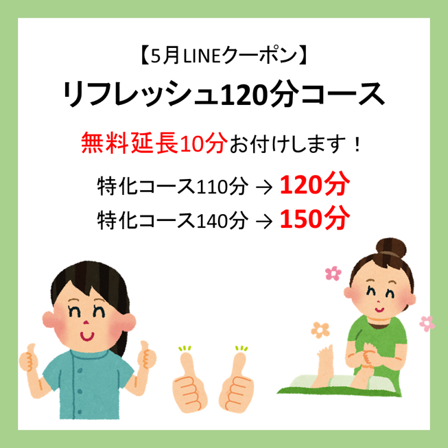 【告知】5月はリフレッシュ120分コースで、お疲れを癒しましょう!