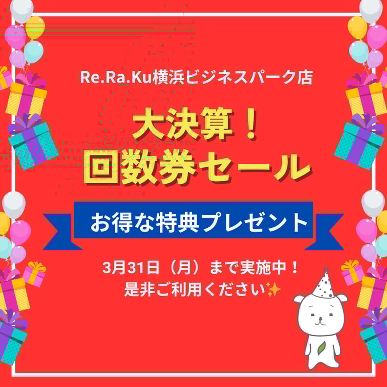 みなさんこんにちは!Re.Ra.Ku 横浜ビジネスパーク店です!あっという間に10月を迎え、2025年も3ヶ月を切りましたね。。月日が経つ速さが年々スピードアップしているように感じます><みなさまお元気ですか? 秋は気圧や天候の変化で心や身体のバランスが乱れやすい季節です。残りの2025年も楽しく過ごせますよう、キャンペーンをご用意いしました♪ 秋のゆったりケア♪選べる2つのコースに+10分プレゼント! 【特典内容】下記2種類の当店大人気の「お疲れ特化コース」に+10分(1,320円相当)をプレゼント☆◆120分コース⇒130分へ♪◆150分コース⇒160分へ♪ ?「お疲れ特化コース」とは?「今」のお疲れに合わせて、様々なメニューからカスタマイズできるコースです!なかでも今回お選び頂ける2つのコースは、なんと当店の全てのメニューが対象なので、「気になるお疲れに狙い撃ち」でも「くまなく全身スッキリプラン」でもOK!お時間配分や入れたいメニューなどは担当スタッフとお気軽にご相談下さい^^ 120分…15,620円(税込)150分…18,920円(税込) ぜひゆったりした特別な時間で、秋を健やかに過ごしていきましょう♪