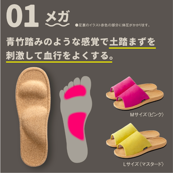 01のメガのfumippaは、メガというだけあって足裏の広範囲を刺激していただけるので、自宅の移動に活用するだけでも青竹踏みのような感覚で土踏まずを刺激して血行を促進することが期待されています。