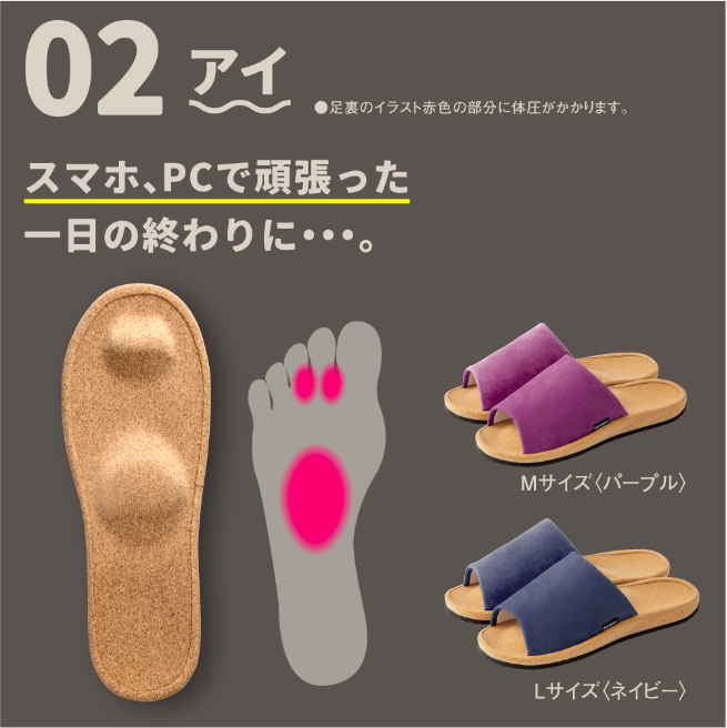 02アイはMサイズ(23cm〜25cm)とLサイズ(25cm〜27cm)の両サイズでご案内ができるため、腎臓の反射区への刺激が欲しい方にはお勧めです。