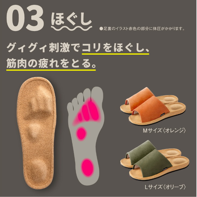 03のほぐしのfumippaは、足裏をグイグイと刺激し、凝り固まった筋肉をほぐし疲れをとるツボにアプローチする事ができます。